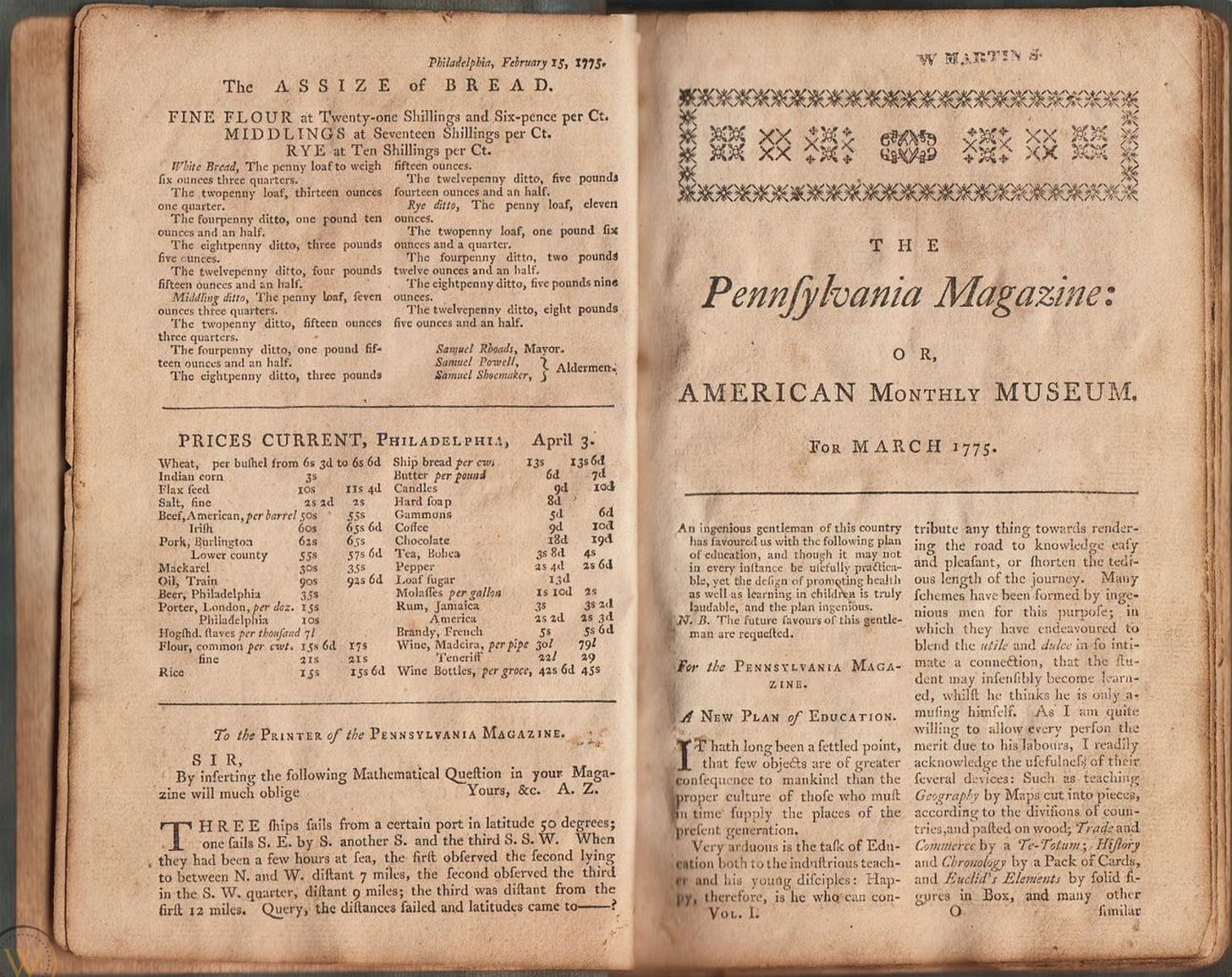 Paine came to the British American colonies in late November of 1774 to live in Philadelphia, Pennsylvania. He arrived at a time when Philadelphia had a population of at least 30,000 people and thousands of new settlers were beginning to arrive annually in search of fortunes and opportunity. It was the most populated city in the colonies and attracted the most diverse interests in the arts, commerce, invention, and the sciences of the time. He took a job as an editor for the Pennsylvania Magazine, often signing his work with pseudonyms like Aesop, Atlanticus, Vox Populi, or Humanus. His political writings probably gained him social status in the city, making connections with people like George Washington, James Monroe, James Madison, and Thomas Jefferson. His writings contained fierce commentary on the nature of British monarchy and its tyranny over people from far away. He was greatly influenced by the enlightenment philosophers of Europe like John Locke, Rousseau, and the critical writings on reason, Christianity, and slavery by Voltaire. Paine opposed slavery and was one of the earliest advocates of social security, universal free public education, and a guaranteed minimum income by means of direct federal funding and taxes on inherited property. He was also an inventor patenting an iron bridge in England, attempted to create a smokeless candle, and worked with John Fitch from Windsor, Connecticut on the early development of steam engines.