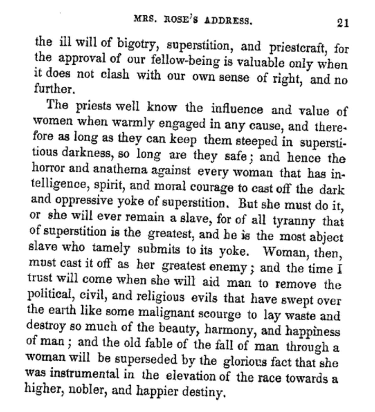 She traveled by rail and stagecoach to more than 23 US states, speaking in churches, barns, halls, and state legislatures. Rose refused to accept any fee for her public appearances and insisted on paying her own traveling expenses, paying for their expenses by way of her and her husbands small businesses out of their home in New York City (source). Rose favored debating points of differences with other people and reformers as she believed this was the way to reach truth. She was a regular speaker at the annual January 29th Thomas Paine Dinner in New York, speaking about anti-slavery, women’s rights, and freethought ideas and by 1853, she become the first woman president of that organization.