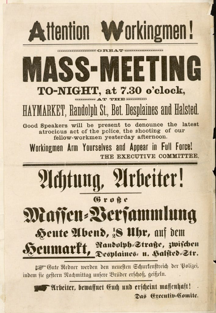 On Saturday May 1st, 1886 (now a national public holiday in many countries across the world) a strike began throughout the United States in support of an eight-hour work day. Over the next few days between 300,000 and 500,000 men and women refused to go to work. In Chicago, over 40,000 people were on strike against their employers. Police forces alongside the US Army and National Guard were dispersed everywhere, often violently antagonizing and beating workers, and trying to get them to go back to work. Many speeches were held from podiums, preaching to the workers out on strike. This event is known as the Haymarket Affair. However, on the night of May 4th, August Spies was one of the many to give a lecture to the crowds, when not long after, a bomb filled with dynamite exploded killing seven policemen with around 60 policemen wounded, and at least four workers died. The next morning, Spies was arrested along with several other known leftists and put in jail. He spent months attempting to appeal his case as he was most certainly innocent of the crime. Due to his affiliations with leftist organizations, he was one of several people singled out and accused for the crime. His case went up to the Illinois Supreme Court (Spies v. Illinois) where they determined that speech and printed materials constituted enough evidence to be held criminally responsible for the death and violence that day. Eight anarchists and socialists were indicted for the incident and all but one sentenced to death.